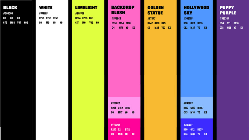 I developed a bold wordmark and a versatile high-contrast rainbow palette that pops against the brand's vibrant celebrity photography and complements the production design across their show lineup.