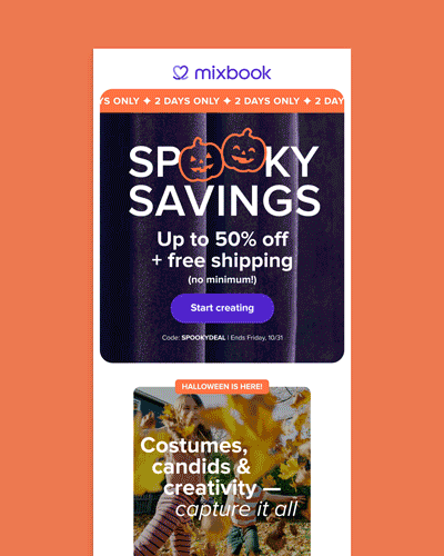 I designed a series of emails for Mixbook's 2025 Spooky Savings Halloween campaign. Art direction by Tessa Luedtke.