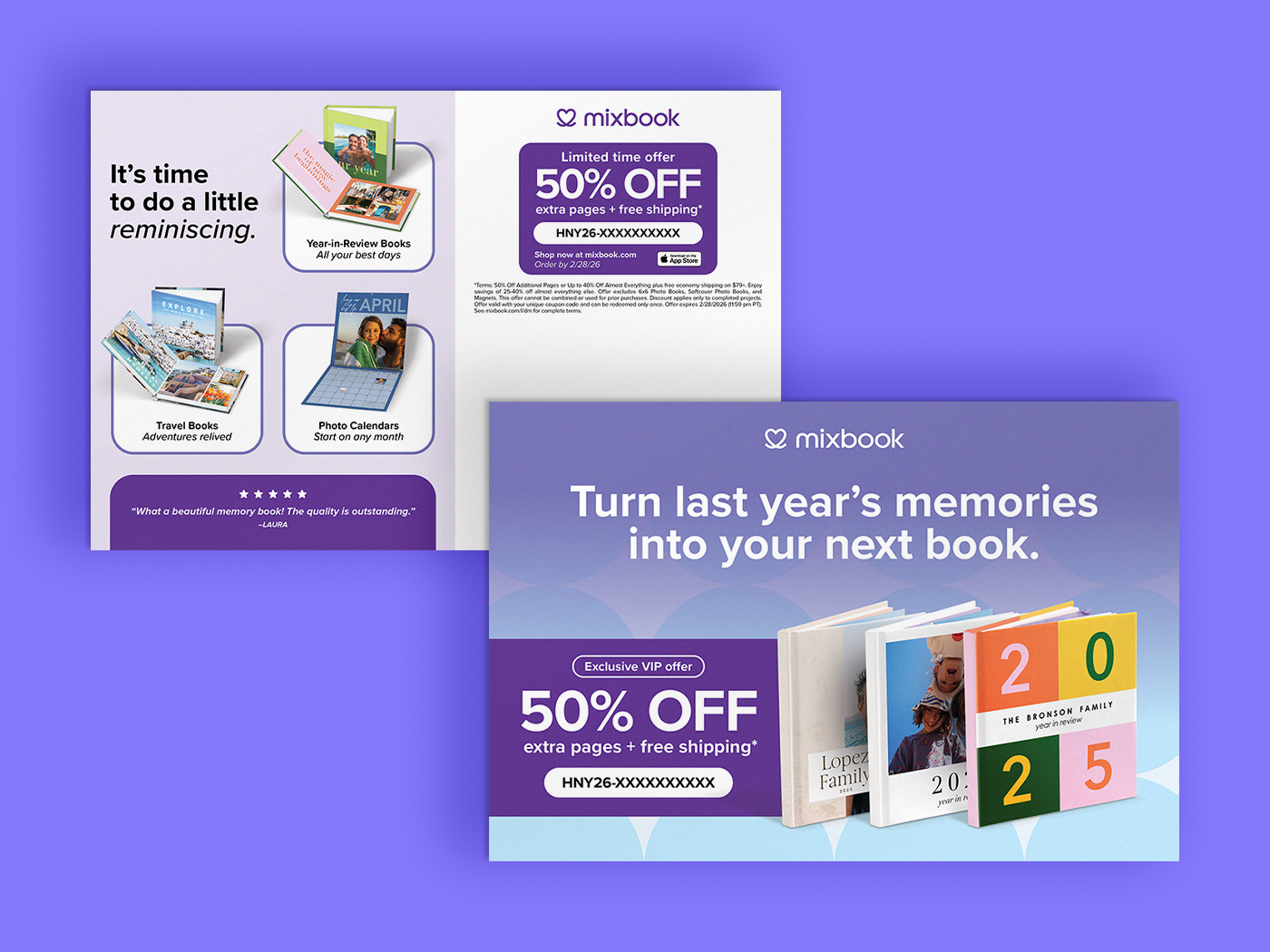 I designed the layout for several direct mail marketing pieces for Mixbook's 2025 Holiday campaign. Art Direction by Tegan Anderson.