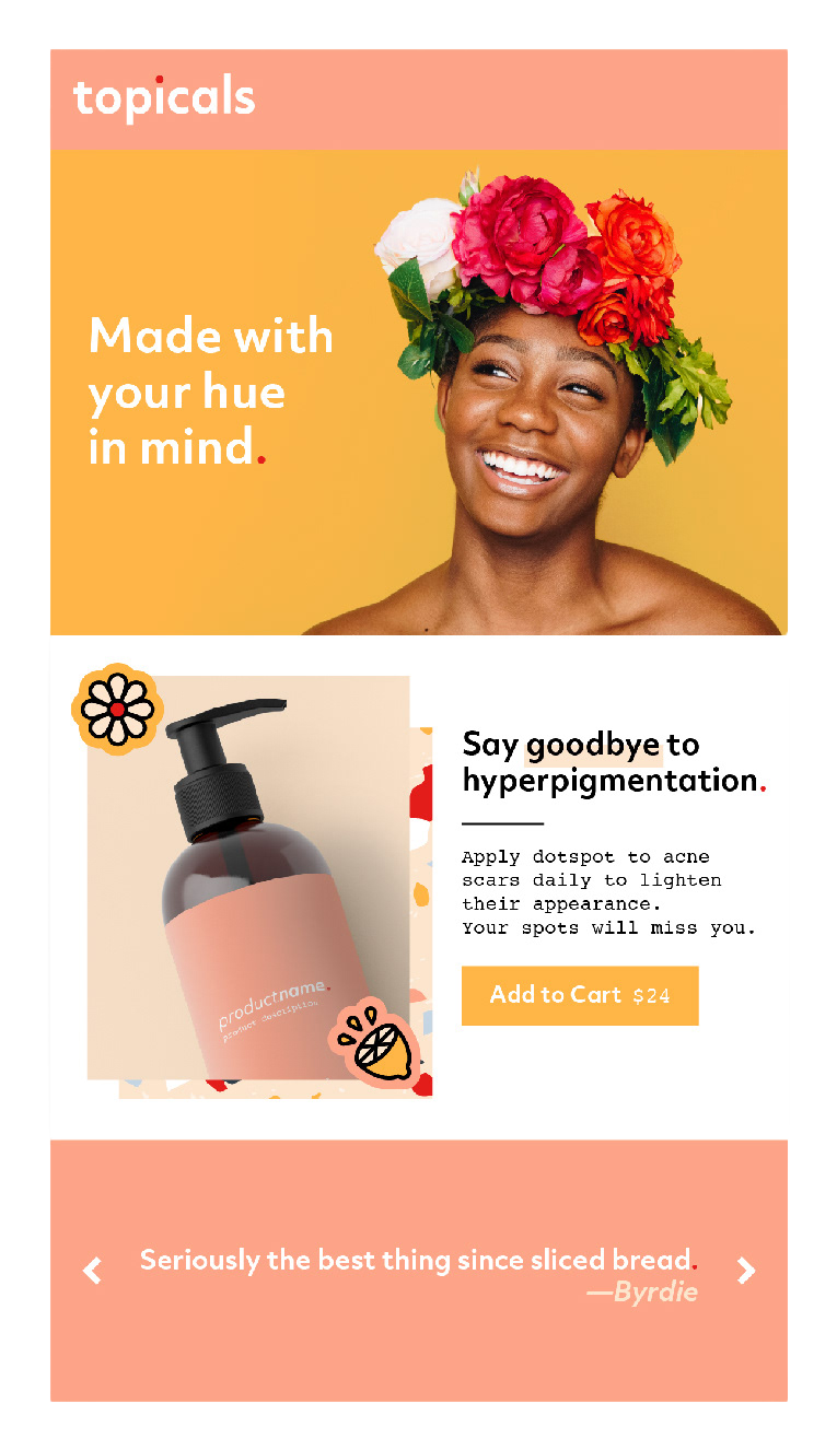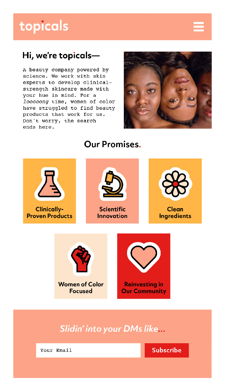 Exploratory brand identity and web design for Topicals Rx Inc., a clinical skincare company designed with women of color in mind.